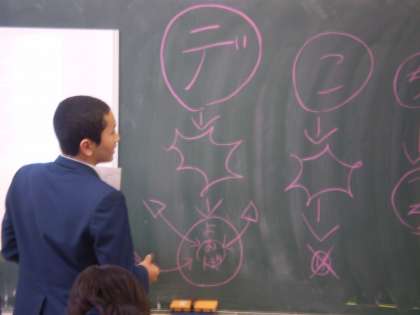 黒板や実物投影機を使ってプレゼンテーションを行った生徒もいました。聞き手の注目を集めるため、とても良い工夫がされていました。