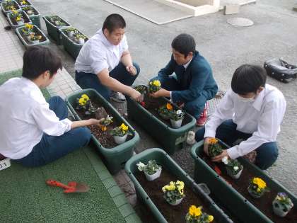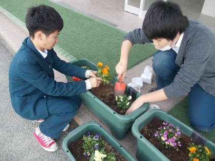 12月3日(水)、ボランティア部の3年生が、昇降口にあるプランターに、パンジーやビオラを植えてくれました。卒業式に、これらの花のフラワーロードを通って、門出ができるといいですね。