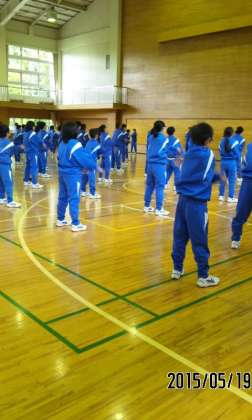 みんな時間通りに起床し、体育館で朝礼 ラジオ体操をしています