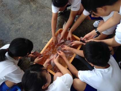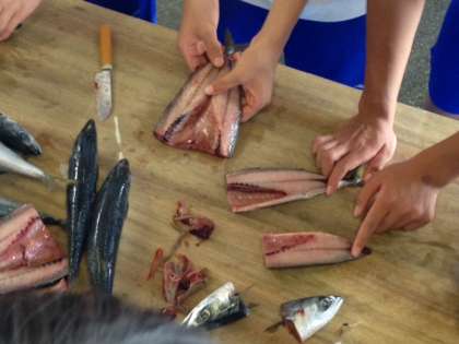 1日目の最後の体験は少し場所を変えて干物づくりです。三枚におろして、しっかり洗います。