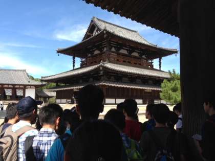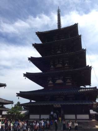 法隆寺の金堂、五重の塔、講堂などを見学。かなり気温が上がり、暑いのですが、お天気に恵まれている幸せを感じながら歩きました。次は奈良公園へ。