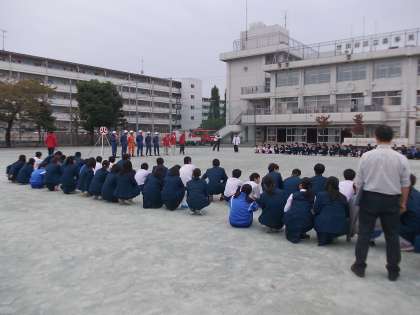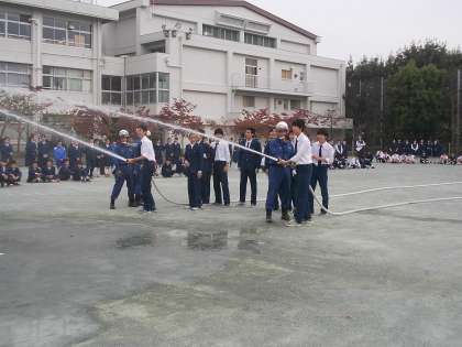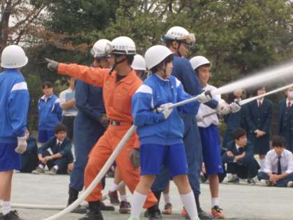 10月10日(土)、成城消防署の方々と町会の方々をお招きして、消防訓練が行われました。D級可搬ポンプを使った消火訓練でした。代表生徒が体験し、いざという時の心構えを全員が学びました。
