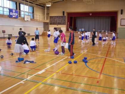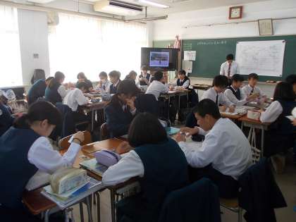 10月28日(水)、近隣の小学校の先生方をお招きして、合同の研修会が行われました。体育・英語・社会・音楽の授業を、中学校の授業スタイルで行いました。