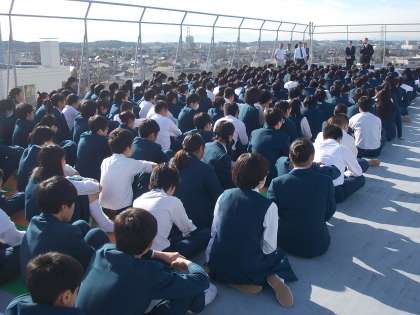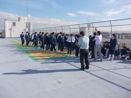 11月16日(月)、昼休みに、津波を想定した避難訓練が行われました。多摩川が氾濫し、屋上へ避難することになった訓練です。