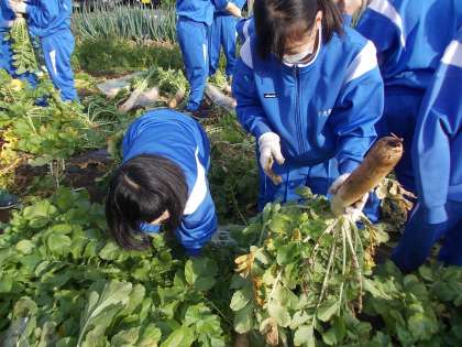 12月7日(月)、待ちに待った大蔵大根の収穫です。今年は大豊作で、生徒たちも、寒さに負けず、汗をかきながら作業をしていました。