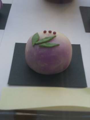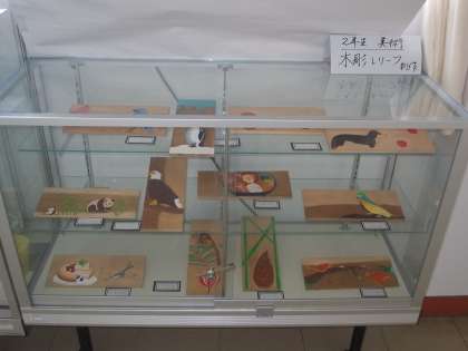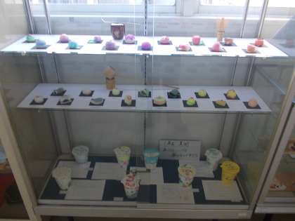 2階、職員室前のショーケースに、美術作品が展示されています。中でも、3年生が取り組んだ和菓子のレプリカ制作は、どれも素晴らしいものです。本物そっくりで、思わず手が出てしまいそうになります。