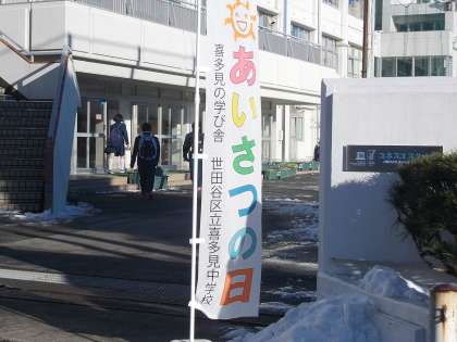 学校運営委員の方が作成してくださった旗のもと、生徒たちは元気よく挨拶をしてくれています。、