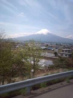 間もなく河口湖インター。バスの窓から富士山が見えました。完成があがりました。雪が積もっています。