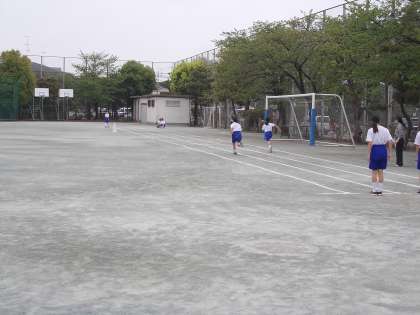 4月21日(木)、学校主事の方々のご協力により、正門に植樹されていた松を移植しました。校庭では1年女子が50m走を行っています。