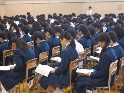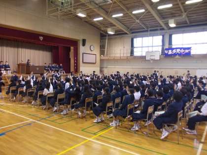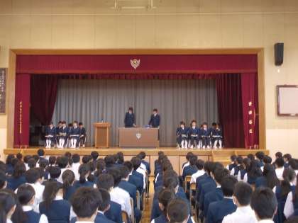 5月2日(月)、連休の合間の月曜日です。6時間目に生徒総会がありました。生徒会や各委員会で討議してきた活動方針を全体に発表、承認する場です。全員、真剣に取り組んでいました。