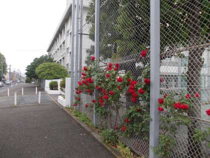 5月10日(火)、天気は曇りですが、校庭周辺のフェンスに沿って、薔薇が鮮やかに咲いています。喜多見中学校にお越しの際は、ぜひとも薔薇の鑑賞も。