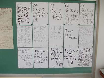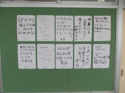 6月21日(火)、1年生の廊下掲示です。教科「日本語」の哲学で「考えることを考える」授業の一環で、リーダー像について考えています。