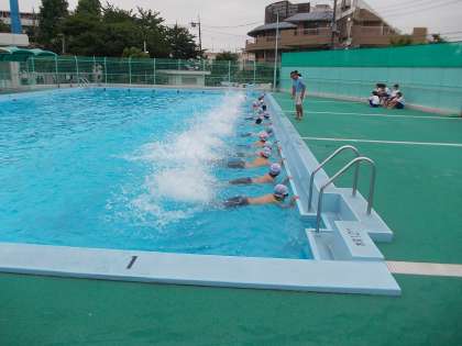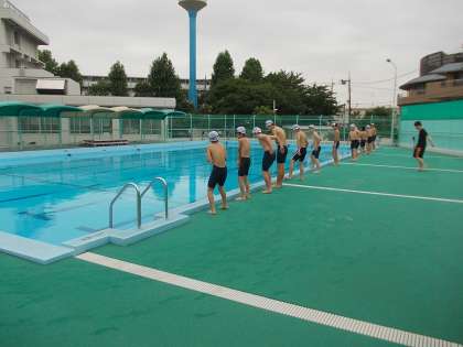 7月5日(火)、1年生男子の体育は水泳です。7月より本校でも水泳指導が始まっています。今日は少々肌寒い気候ですが、水温は昨日の暑さからか29度ほど。安全に配慮しながら指導を行っています。
