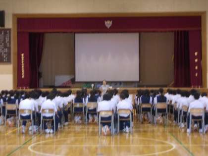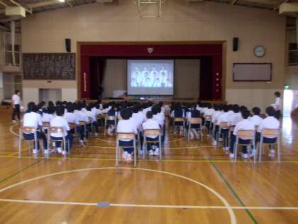 7月11日(月)、1年生は体育館で学年集会を行っています。10月に行われる合唱コンクールに向けてのイメージ作りです。担当の先生から説明があり、2年前のコンクールのDVDを鑑賞しました。
