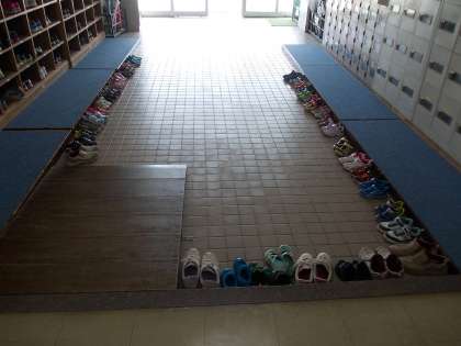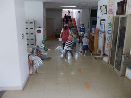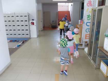 7月12日(火)、本校の校舎を使用して、小梅保育園の避難訓練が行われました。多摩川が氾濫したとの想定で、高い場所に逃げる訓練です。自分の靴をしっかりそろえ、静かに屋上まで避難していました。感心しました!