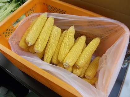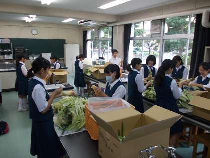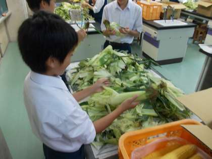 7月13日(水)、7時半過ぎにボランティア部が集まって、今日の給食に出されるとうもろこしの皮むきをお手伝いしました。大勢の協力のもと、すぐに皮むきは終了しました。みんなでやると早い!