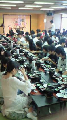 今朝のメニューは、御飯・豚肉ともやしと油揚の味噌汁。焼き魚、生ハムと野菜、梅干し、笹餅、ふりかけです。おいしい、おいしい。