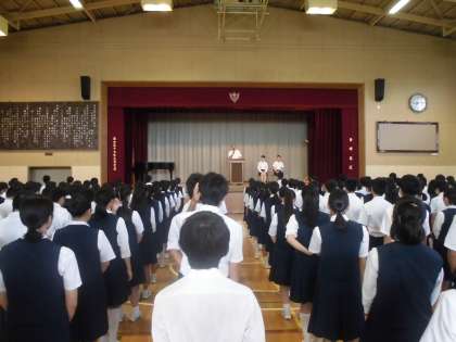 9月5日(月)、全校朝礼が行われました。校長先生からは「地域の方々とのつながりを大事にしよう」とお話がありました。また、今日より2週間、給食実習が行われます。2名の実習生が本校に来ています。校長先生より紹介がありました。