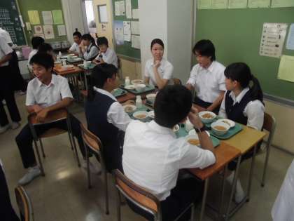 9月8日(木)、給食実習生が3年生の教室で一緒に給食をいただきます。楽しそうに話をしながら、実習も4日が過ぎようとしています。