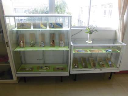 生徒の作品が職員室前のガラスケースに飾られています。来週は学校公開期間です。ぜひ生徒の様子をご覧ください。