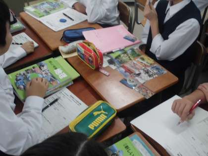 10月13日(木)、1年生の社会では地理的分野を学んでいます。人々の生活と環境を関連付けて、住居や衣服の特色を写真を用いて学んでいました。