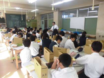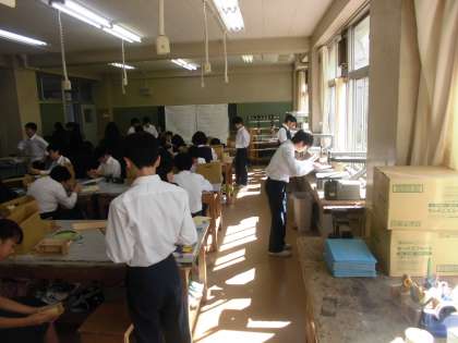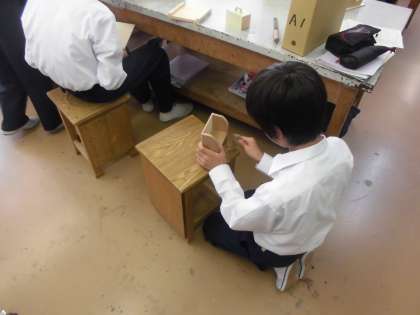 10月20日(木)、1年生の技術では「小物入れを作ろう」ということで制作を行っています。両刃のこぎりや糸のこ盤、やすりなどを使用して、完成をめざしています。