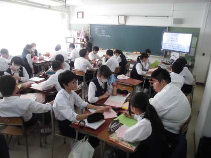 10月27日(木)、3年生の社会は公民的分野の裁判員制度のことを学んでいます。教材を活用して有罪、無罪の評決を行っています。
