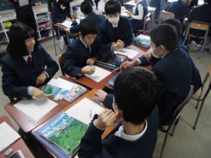 10月28日(金)、1年生の英語の授業では、ペアワークや班で教科書の文章を協力しながら読み進めていました。