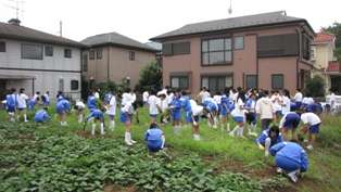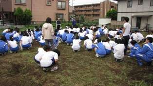 食育の一環として、1年生は農業体験(大根つくり)を行います。今日は、その第1歩、畑の草取りです。途中で遊びたくなった生徒もいるようですが、最後の集合ではかなりきれいになりました。これからが楽しみです。