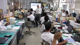 校務用パソコンについての研修会です。講師の方の説明を真剣に聞いています。