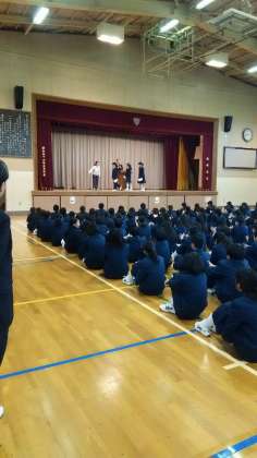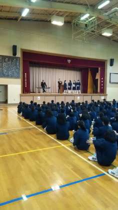 11月14日(月)、全校朝礼が行われました。副校長より「今、ここで頑張ることの大事さ」について話がありました。安全指導ではストーブの使い方。競書会とハーフマラソン、バドミントン部の表彰がありました。
