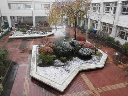 11月24日(木)、朝から雪が降っています。中庭もうっすらと雪化粧。生徒は元気に登校しています。