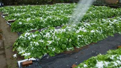 11月24日(木)、大根畑を見てきました。青々とした葉っぱに雪がかぶっていました。収穫の前にちょっとした試練ですね…