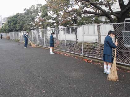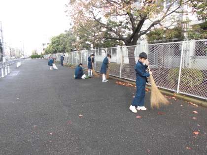 11月28日(月)、早朝からボランティア部が中心で落ち葉掃きを行っています。秋から冬になるこの時期、落ち葉がたくさん落ちています。道路もきれいになりました。