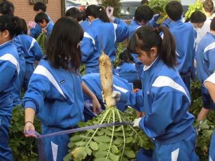 12月12日(月)の午後、天候にも恵まれ、9月から生長を見守ってきた大蔵大根を収穫しました。1年生全員で協力して、大きく育った大根を傷付けないよう丁寧に収穫しました。お世話になった農家の方々、本当にありがとうございました。