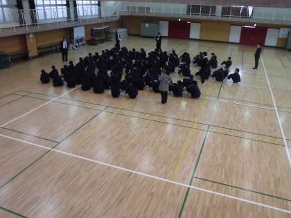 12月22日(木)、今日は午後に終業式がありますが、その前に学年で今学期を振り返っています。1年生は格技室で集会がありました。