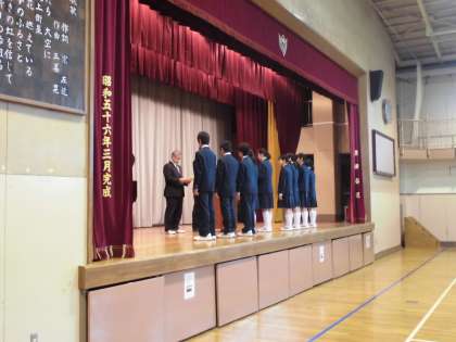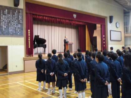 12月22日(木)、2学期の終業式が行われました。校長先生からは「失敗も大事な宝物」として生活に生かしていくことが大事だとの話がありました。新年の決意も新たに、充実した冬休みを過ごしましょう。式後、バドミントン部と卓球部の表彰がありました。