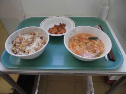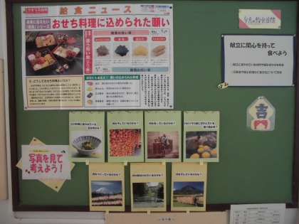1月11日(水)、3学期も今日から給食が始まりました。平成29年最初のメニューは「肉もやしごはん キムチチゲ 揚げちぢみ」です。職員室前には今月の目標も掲示されています。
