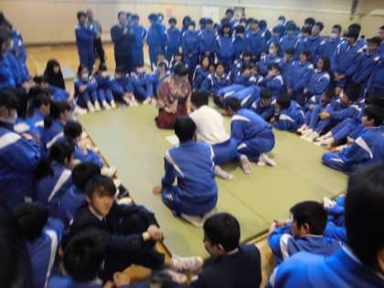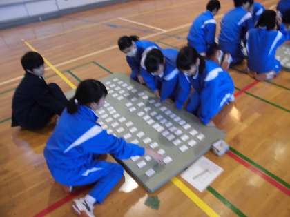 1月16日(月)の午後、1・2年生で百人一首大会が行われました。かるた永世クイーンの渡邊令恵(わたなべふみえ)様に講師として来ていただき、最後はお手合わせまで代表生徒としていただきました。