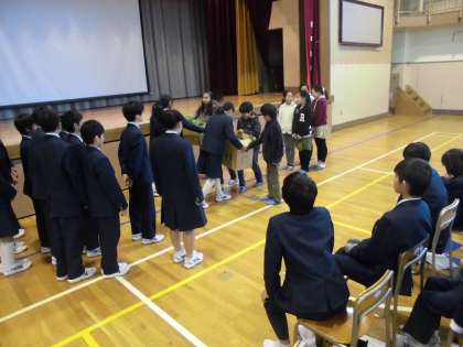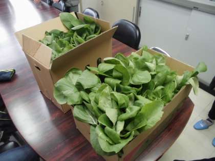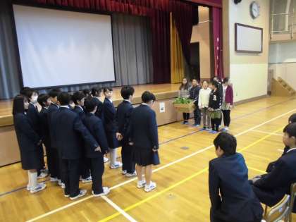 1月23日(月)、喜多見小学校で収穫した小松菜を6年生の代表児童が持参してくれました。1年生の学年集会で交換会(大蔵大根を先月、中学校から小学校へ持参したお礼)を行いました。明日の給食のメニューに入っています【わかめサラダ】。