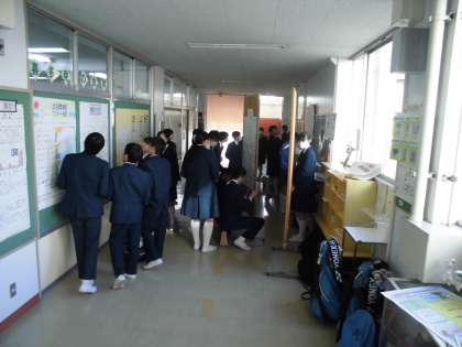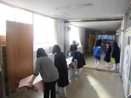 2月3日(金)6時間目、明日から始まる「学習成果展覧会」の準備が始まっています。みんなで協力して、自分たちの学習成果を展示しています。