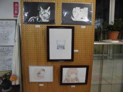 美術部は7人で活動した作品…部活内で描いた絵などを職員室前に掲示・展示しています。