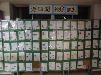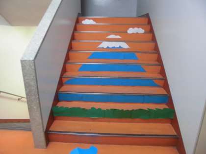1年生は11月に「河口湖移動教室」に行きました。そのレポートをまとめました。また階段に河口湖・富士山をイメージした絵を貼っています。