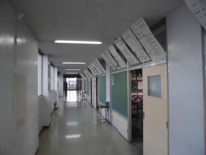 2月15日(水)、2年生の廊下(3階)に今週金曜日に迫った上級学校訪問の事前学習が掲示されました。掲示も工夫されていて、頭上を見上げる位置に各学校の紹介があります。
