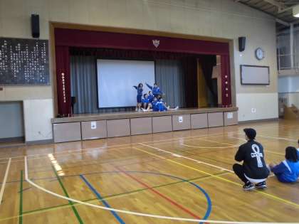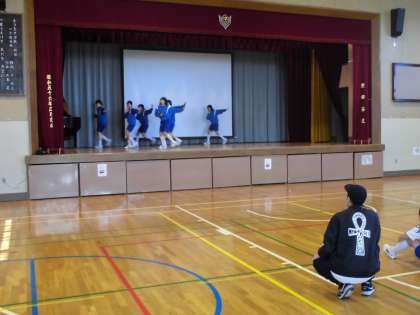 2月16日(木)、1年女子の体育の授業では、ダンス発表会が行われています。先日から来ていただいている講師の方にご指導いただき、この日を迎えています。「失敗してもいいから全力で!」と励ましを受け、元気に舞台でダンスを披露しました。