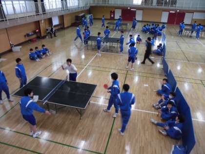 3月21日(火)、3年生が卒業した後の学校は、少々寂しい感じがします。今日は1年生が球技大会を行っています。天候が雨模様なので、体育館と格技室を使って、熱戦が繰り広げられています。