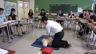 日常の校内生活や夏休み部活動の安全対策として、専門の方を招き、応急手当の校内研修会を行いました。AEDの使い方、人工呼吸、心臓マッサージ等について研修しました。