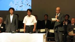 「世田谷9年教育」の推進に伴い、区内の小・中学校がグループを結成して試行が始まりました。砧南小学校、喜多見小学校、喜多見中学校の3校がグループ(『花と緑のび舎』)を結成しました。区民会館での発表の様子です。