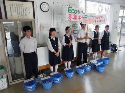6月16日(金)、昇降口で生徒会役員が毎週金曜日にペットボトルキャップを回収しています。生徒の自主的な活動を促して、社会参画・貢献する力をはぐくむ目的で始めました。集めたキャップは「NPO法人」に送付します。