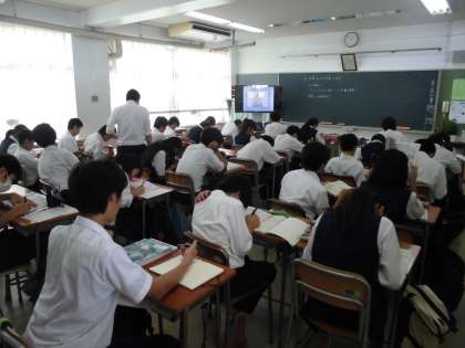 7月5日(水)、2年生の社会の授業です。人口グラフを見ながら、資料を読み取る授業を行っています。読み取る力、活用する力をつける授業です。